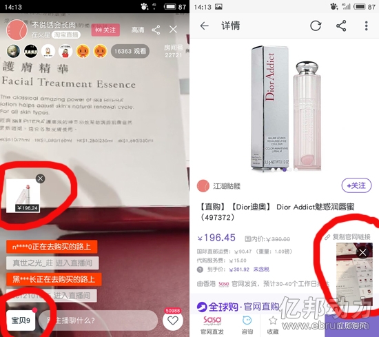 據(jù)億邦動力網(wǎng)了解,全球購買手會直播購買商品的整個(gè)過程,還會根據(jù)用戶的留言,詢問柜臺業(yè)務(wù)員相關(guān)問題等。用戶點(diǎn)擊直播間左方的圖片或者左下角的“寶貝”,可直接跳轉(zhuǎn)至購買頁面,同時(shí)亦能點(diǎn)擊購買頁面右下角的直播畫面回到直播間。