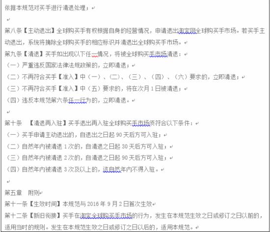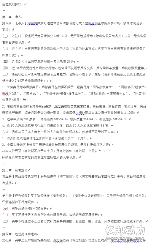 日前,淘寶規(guī)則新增《淘寶網(wǎng)全球購買手市場管理規(guī)范》,明確淘寶網(wǎng)全球購買手市場的賣家準(zhǔn)入標(biāo)準(zhǔn)、清退標(biāo)準(zhǔn)及退出再入駐標(biāo)準(zhǔn);明確淘寶網(wǎng)全球購買手商品及信息發(fā)布、行為規(guī)范相關(guān)要求。