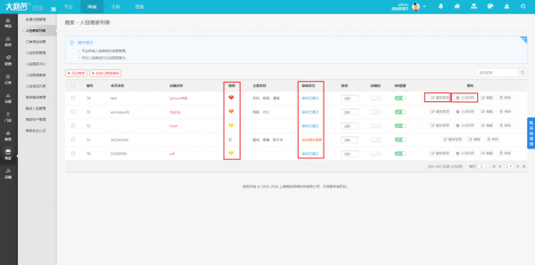 入駐商家審核、分配權(quán)限,列表清晰,操作方便。