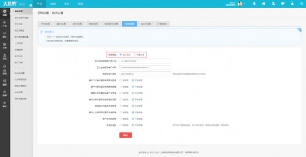 大商創(chuàng)后臺支持阿里大于和互億無線。