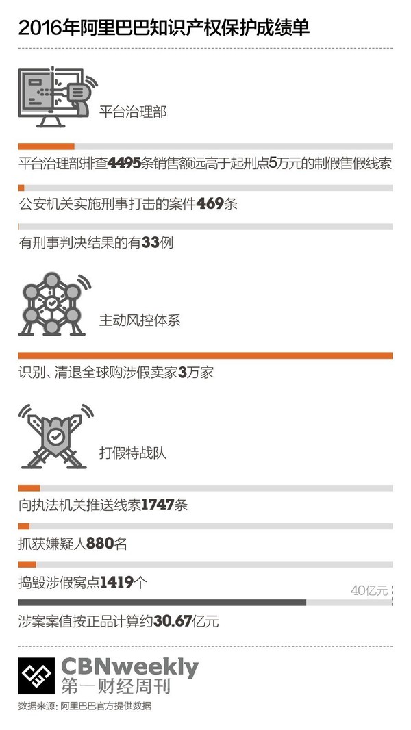 阿里巴巴為打擊假貨成立的內部組織——平臺治理部,2016年排查到銷售額遠高于起刑點的制假售假線索總計4495條,其中公安機能夠依據現行律法采取刑事打擊的只有469個,目前通過公開信息確認已有刑事判決結果的僅33例,而且其中78.7%只判了緩刑。