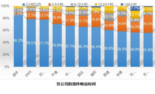 在遞送時長方面,順豐是最快的,同城投遞時間0.8天、異地投遞時間2.8天,遠低于平均時長(同城1天、異地3.4天)。