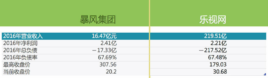 據(jù)choice數(shù)據(jù)顯示,截止到2016年年底,暴風集團和樂視網(wǎng)的總負債分別為17.33億元、217.52億元,負債率分別為67.69%、67.48%。雖然樂視的負債高于暴風200億元,但暴風集團顯示出的種種不利境況也不容忽視。