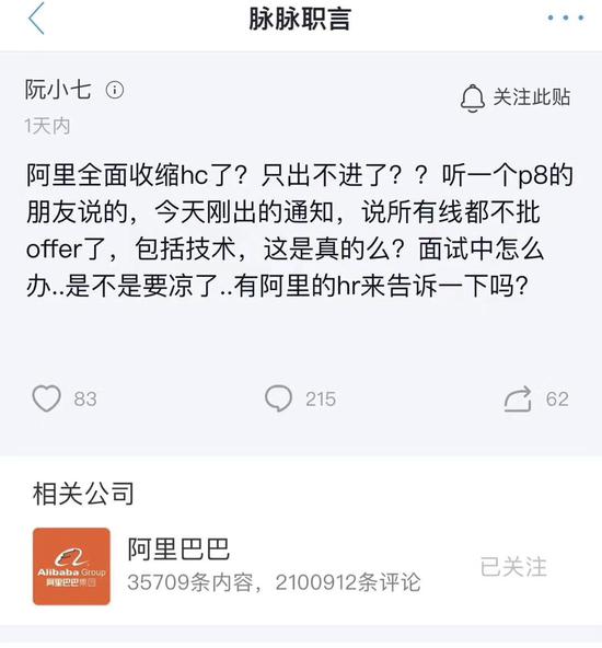 近日,有應聘者在職場社交應用脈脈上留言表示:阿里已全面縮減headcount(人員編制),所有業務線都不批offer,包括技術,近期招不上來的可能就會被砍掉了。