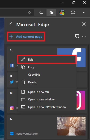 打開Edge Canay-前往任何一個網址-點擊收藏圖標-創建一個命名為Microsoft Edge的新收藏夾/地址欄輸入edge://flags#edge-collections并啟用收藏標志-單擊“添加到當前頁面”,將新網站添加到收藏夾中-右鍵單擊網址并單擊“編輯”-刪掉網站文本用S換掉,重復四次依次拼出U、R、F組成S.U.R.F。