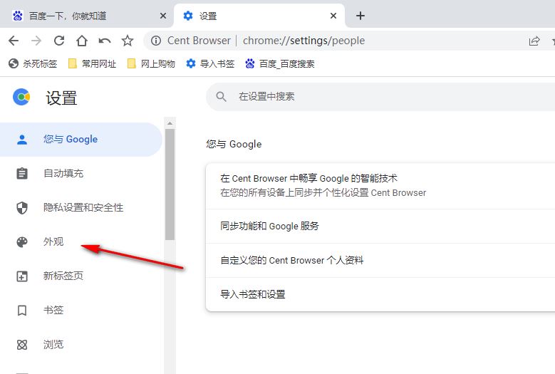 3、進(jìn)入設(shè)置頁面之后,我們在左側(cè)列表中找到“外觀”選項,點擊打開該選項