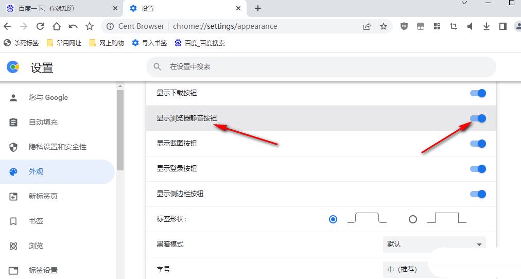 4、進(jìn)入“外觀”選項的頁面之后,我們在該頁面中找到“顯示瀏覽器靜音按鈕”選項,將該選項右側(cè)的開關(guān)按鈕打開
