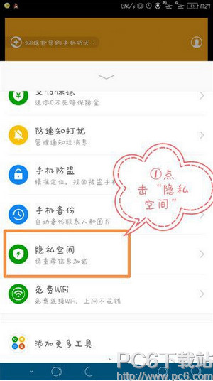1.進(jìn)入到360手機(jī)衛(wèi)士之后,可以看到隱私空間,點(diǎn)開它。