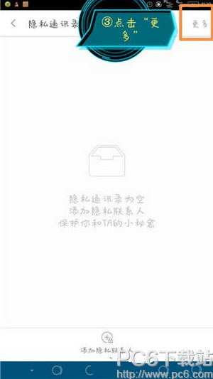 2.進(jìn)入到隱私空間之后你會(huì)看到如圖所示的,隱私通訊錄,點(diǎn)開它。點(diǎn)開之后,在右上角,找到【更多】,點(diǎn)擊更多,如圖。