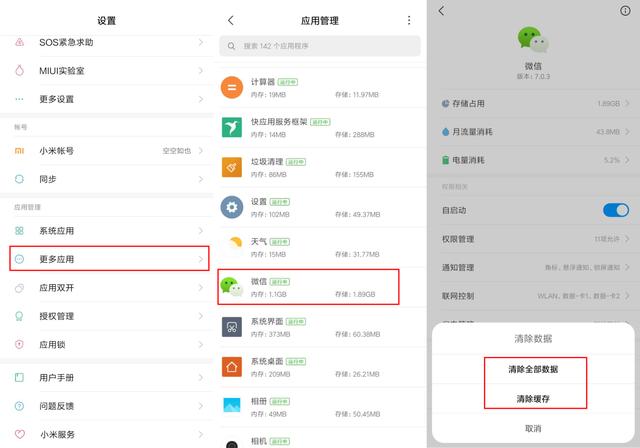 我們能夠通過手機"設置—通用—清理微信儲存空間"清除微信用后的垃圾。我用的是小米,他的流程是"設置—更多應用—微信—清除緩存"。