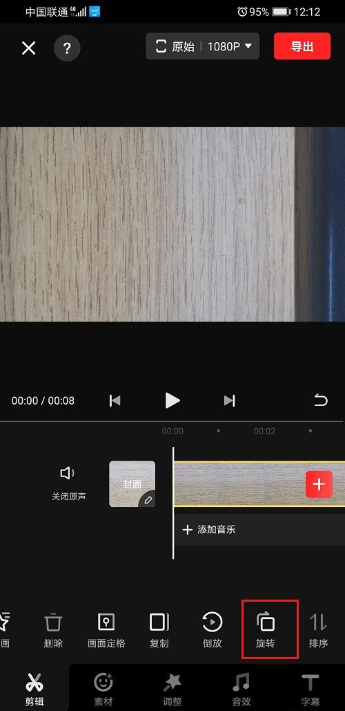 3、進去視頻剪輯界面,向右滑動,找到旋轉,如下圖所示: