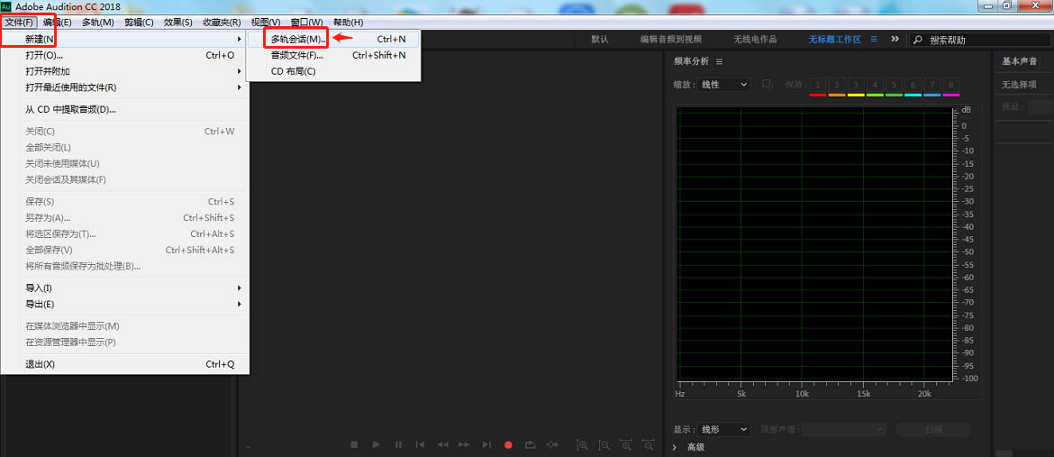 1、首先在電腦中打開(kāi)AU軟件,點(diǎn)擊頂部工具欄中的“新建”——“文件”——“多軌會(huì)話”。