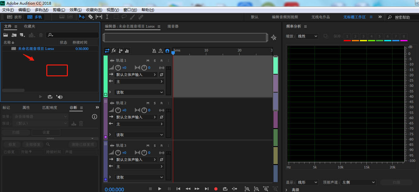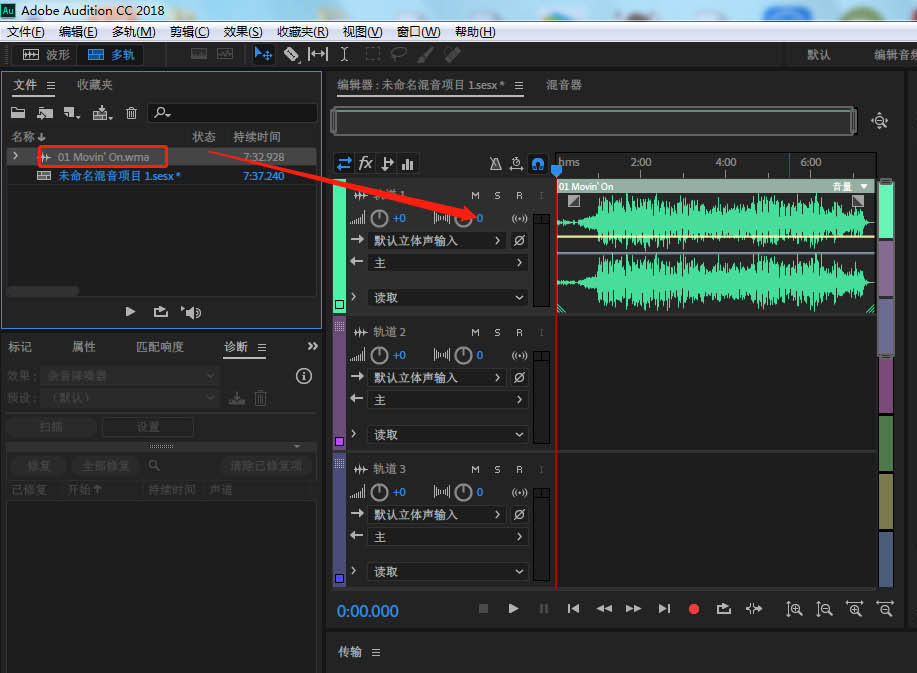3、在軟件中將左側(cè)導(dǎo)入的音頻素材,拖動(dòng)至右側(cè)的多軌會(huì)話當(dāng)中。