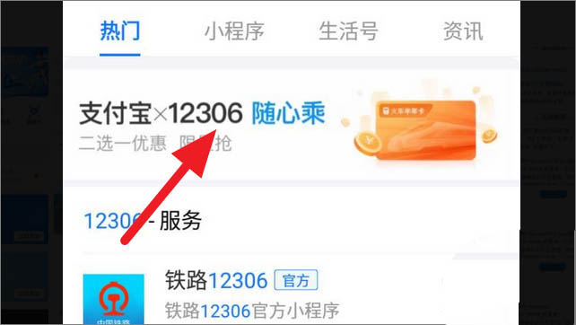 3、出現(xiàn)搜索結(jié)果后,點擊圖中第一個搜索結(jié)果,12306隨心乘