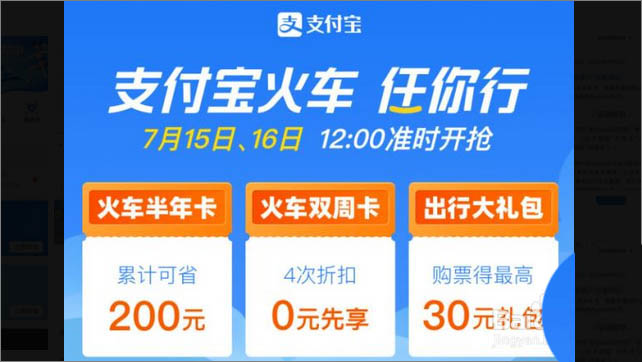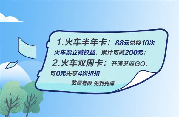 2、火車雙周卡:開通芝麻GO,可0元享4次折扣。