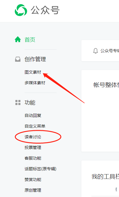 2、登入你的公眾號(hào),看到多了【讀者討論】的功能,我們點(diǎn)擊【圖文素材】