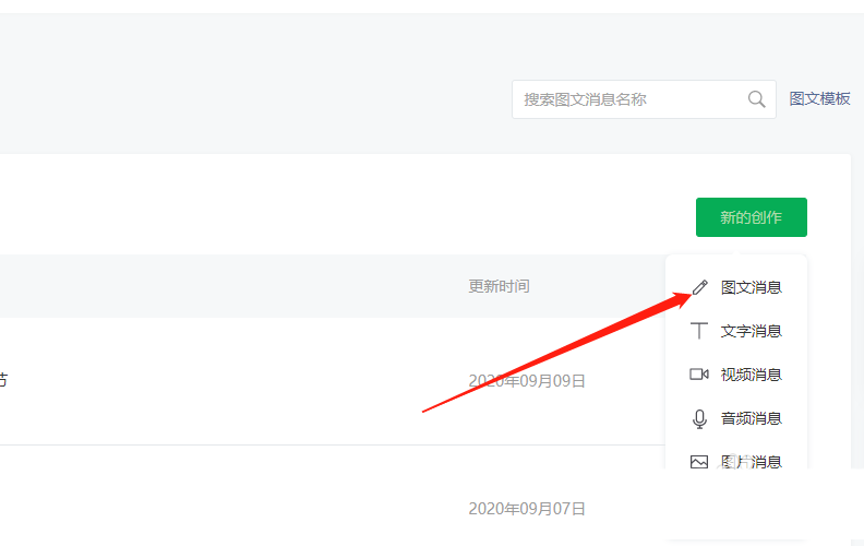 3、再次點(diǎn)擊右邊【新的創(chuàng)作】中的圖文消息