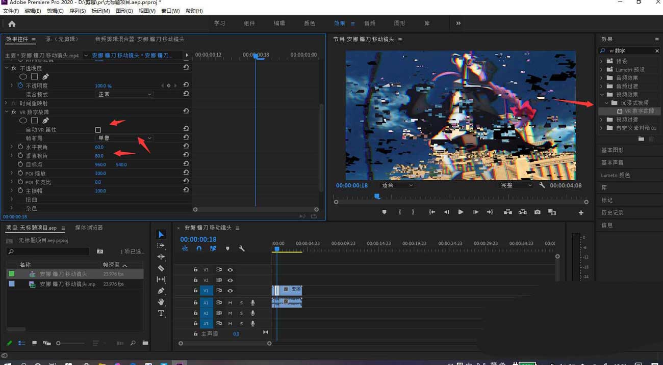 2、效果中搜索vr 數字故障,拖到素材上,勾除自動vr屬性,幀布局改為單向,水平視角60,垂直視角80.