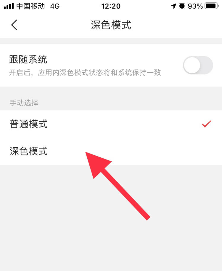 3、跳轉到“深色模式”界面,點擊“深色模式”的選項