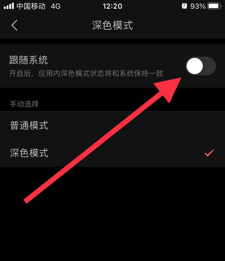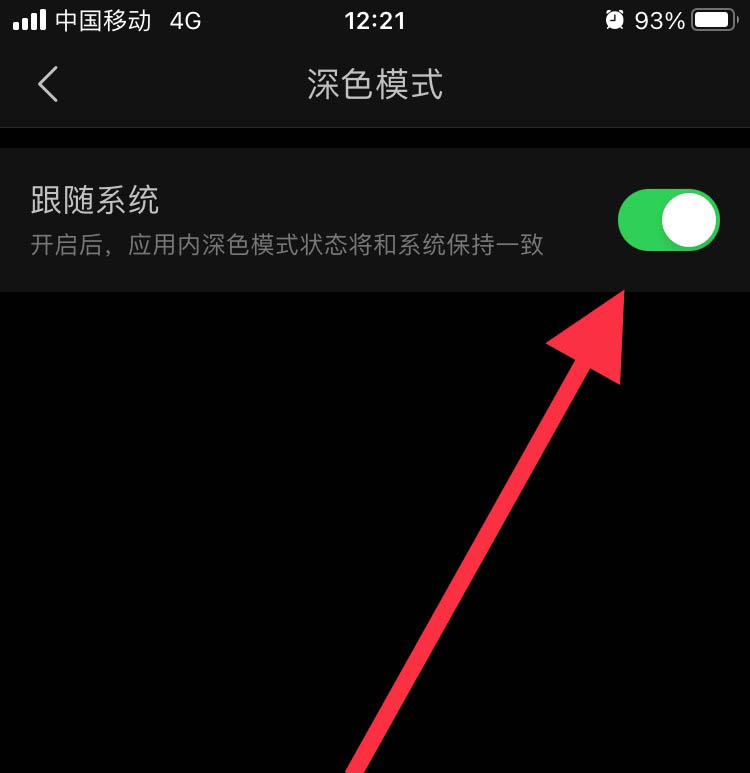 4、接著界面就自動變成深色模式,如果想要模式更隨系統的話,那么將“跟隨系統”右側的滑塊滑到最右側
