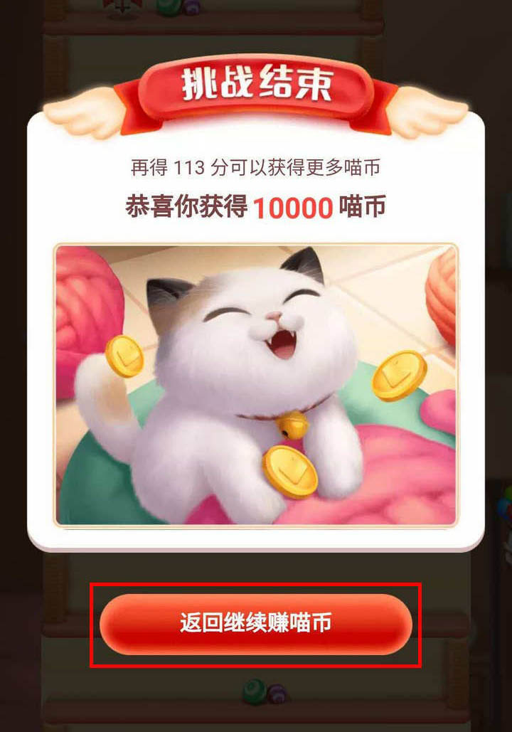6、游戲結(jié)束后,頁面彈窗顯示獲得的喵幣數(shù)量,點擊返回繼續(xù)賺喵幣;