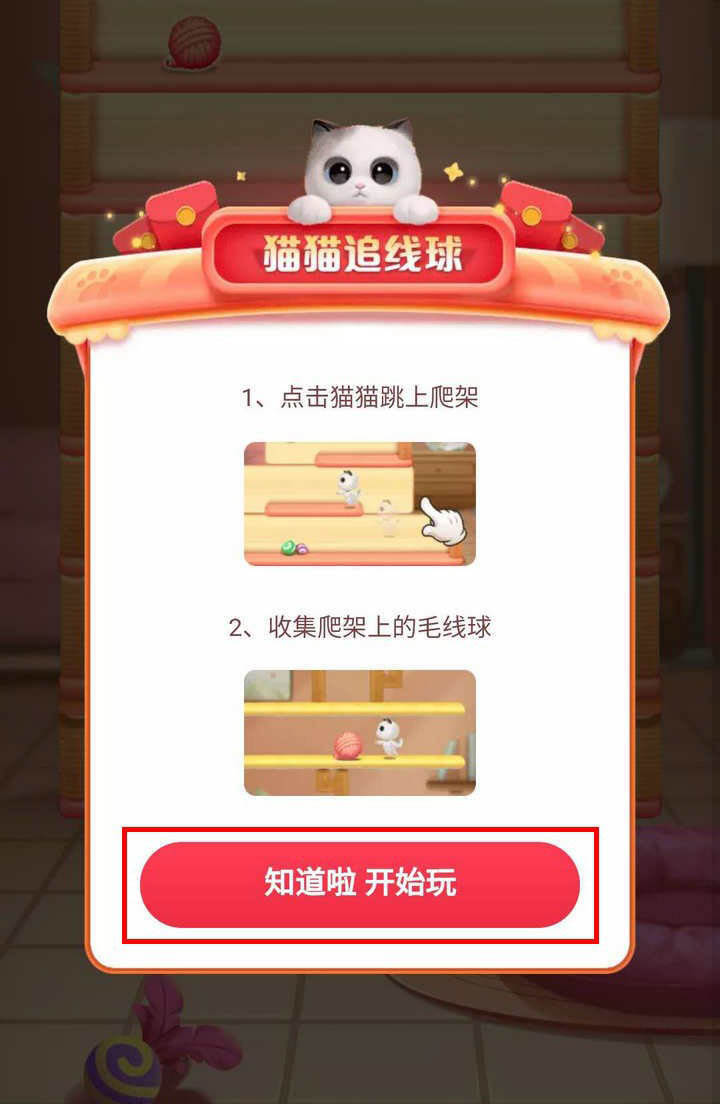 3、進入游戲界面,彈窗顯示游戲名稱叫“貓貓追線球”,還有玩法,點擊知道啦開始玩,貓貓左右跑動,點擊屏幕任意位置,貓貓就會跳躍;
