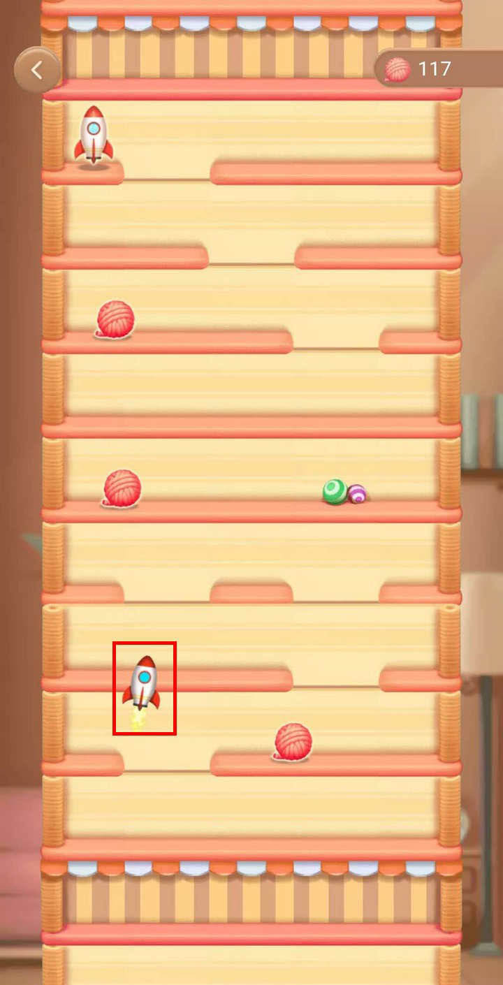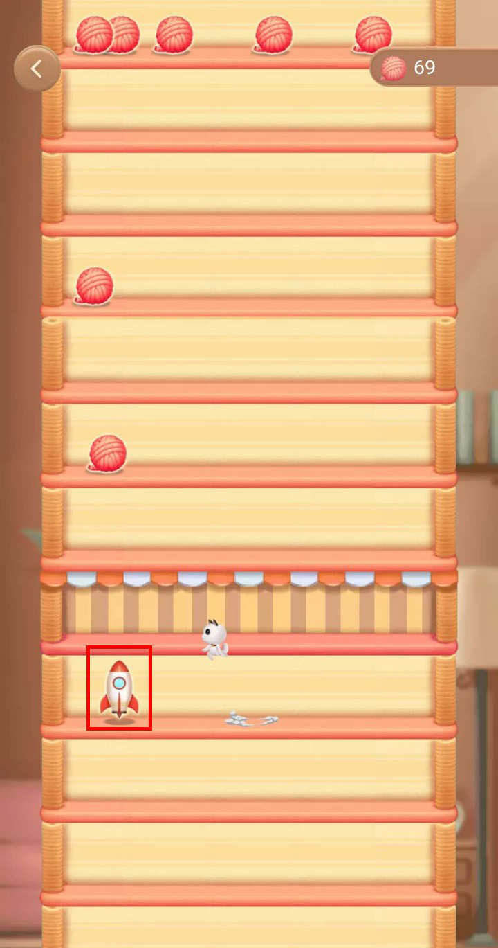 4、剛開始很簡單,爬貓架途中碰到火箭,可以飛好多層,到了60多層,貓架就開始有缺口了,難度加大;