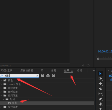 2、然后在效果中搜索殘影,找到殘影效果并拖動到視頻片段上。