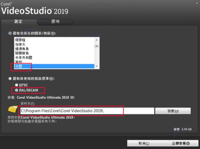 5、設(shè)置選擇中國(guó),標(biāo)準(zhǔn)為pal/secam,默認(rèn)安裝目錄【C:\Program Files\Corel\Corel VideoStudio 2019\】