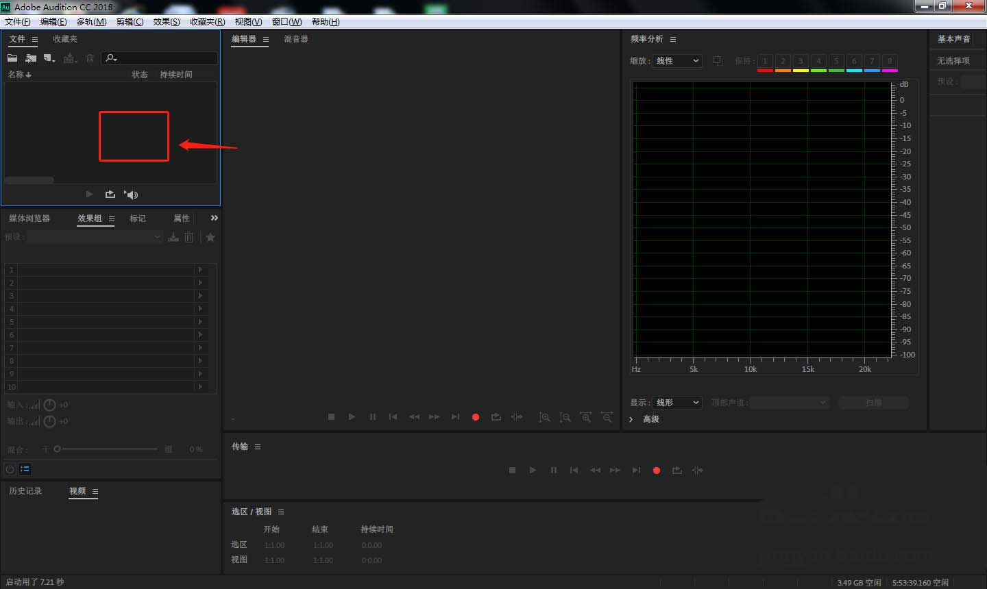 1、首先在電腦中打開AU軟件,點擊左上角區域,將需要的音頻文件導入。