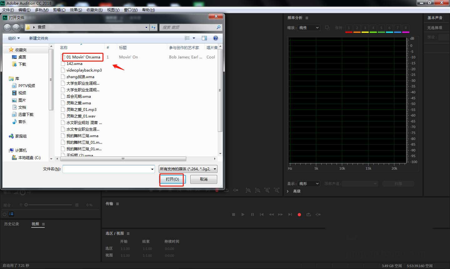 2、在彈出的導入文件窗口中,選擇需要的音頻素材,然后點擊打開按鈕。