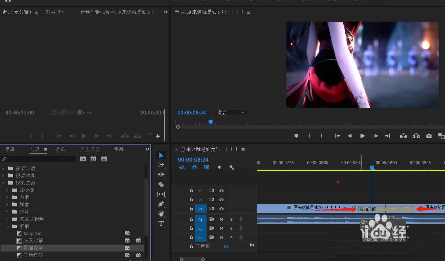 5、圖中箭頭所指示的位置就是疊加溶解效果,之后通過觀看視頻疊加效果做拖動微調