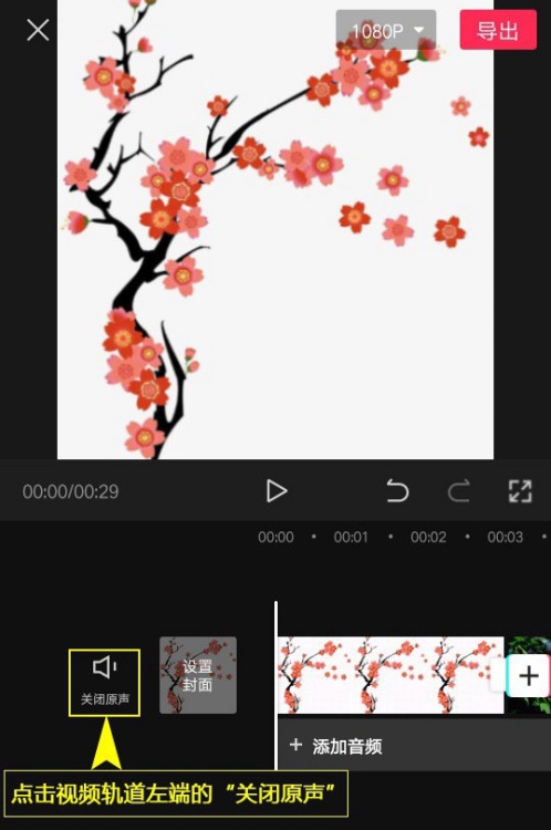 8、關(guān)閉原聲。如果對視頻的原聲不滿意的話,點擊視頻軌道左端的“關(guān)閉原聲”。