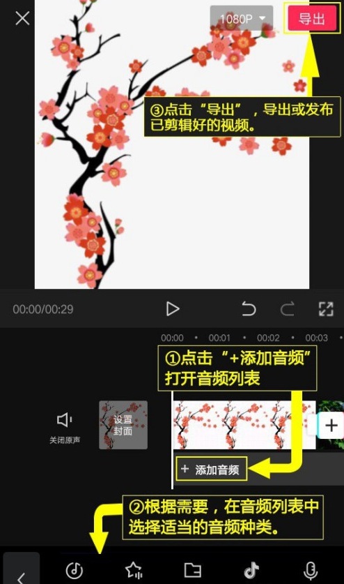 9、添加音樂。點擊音頻軌道左端的“添加音頻”,選擇“音樂”(或“音效”、“提取音樂”、“抖音收藏”、“錄音”等),為視頻添加聲音,最后點擊“導(dǎo)出”,導(dǎo)出已剪輯好的視頻。
