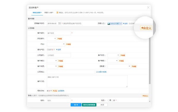 在客戶信息一欄,點擊自定義,進入客戶錄入界面自定義,如下圖: