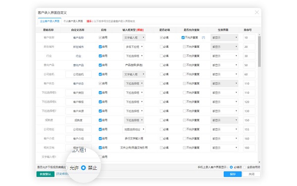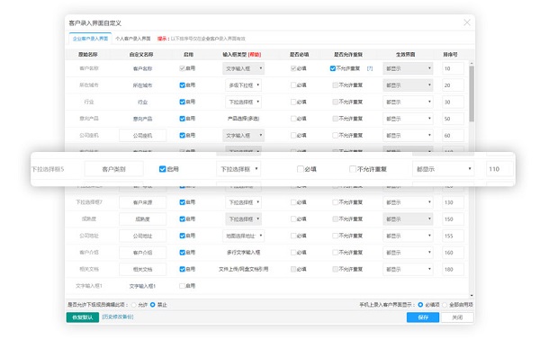 【不可重復】——勾選不可重復則填寫的內容不能重復。例如,客戶名稱和電話號碼不能重復可以避免重復錄入客戶和撞客。