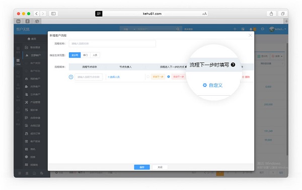 根據公司的銷售模式,設置每個階段的流程節點以及處理人員。流程可以設置適用范圍,設置之后,只有范圍內的員工可以使用該流程。