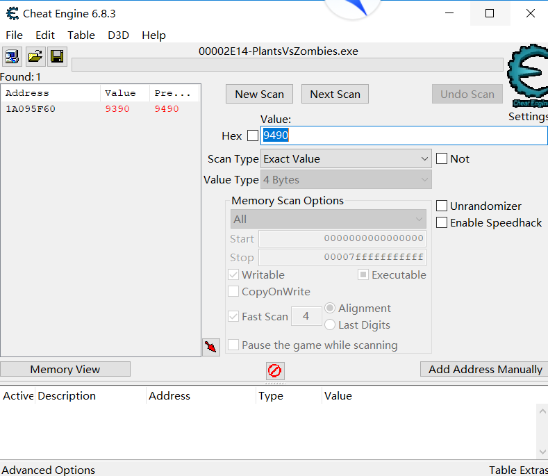 于是游戲中陽光數發生了變化,變成了9390,這時候我們看欺騙工具,顯示地址也變化了,變成了9390