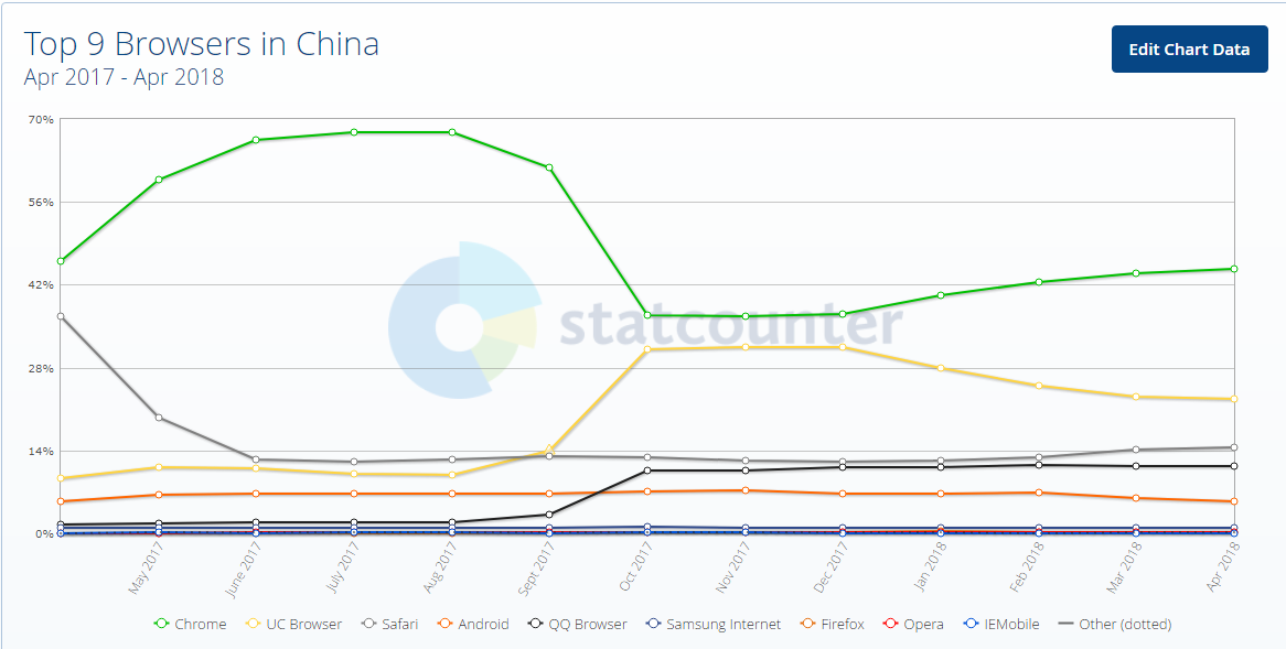 中國用戶的瀏覽器市場份額: